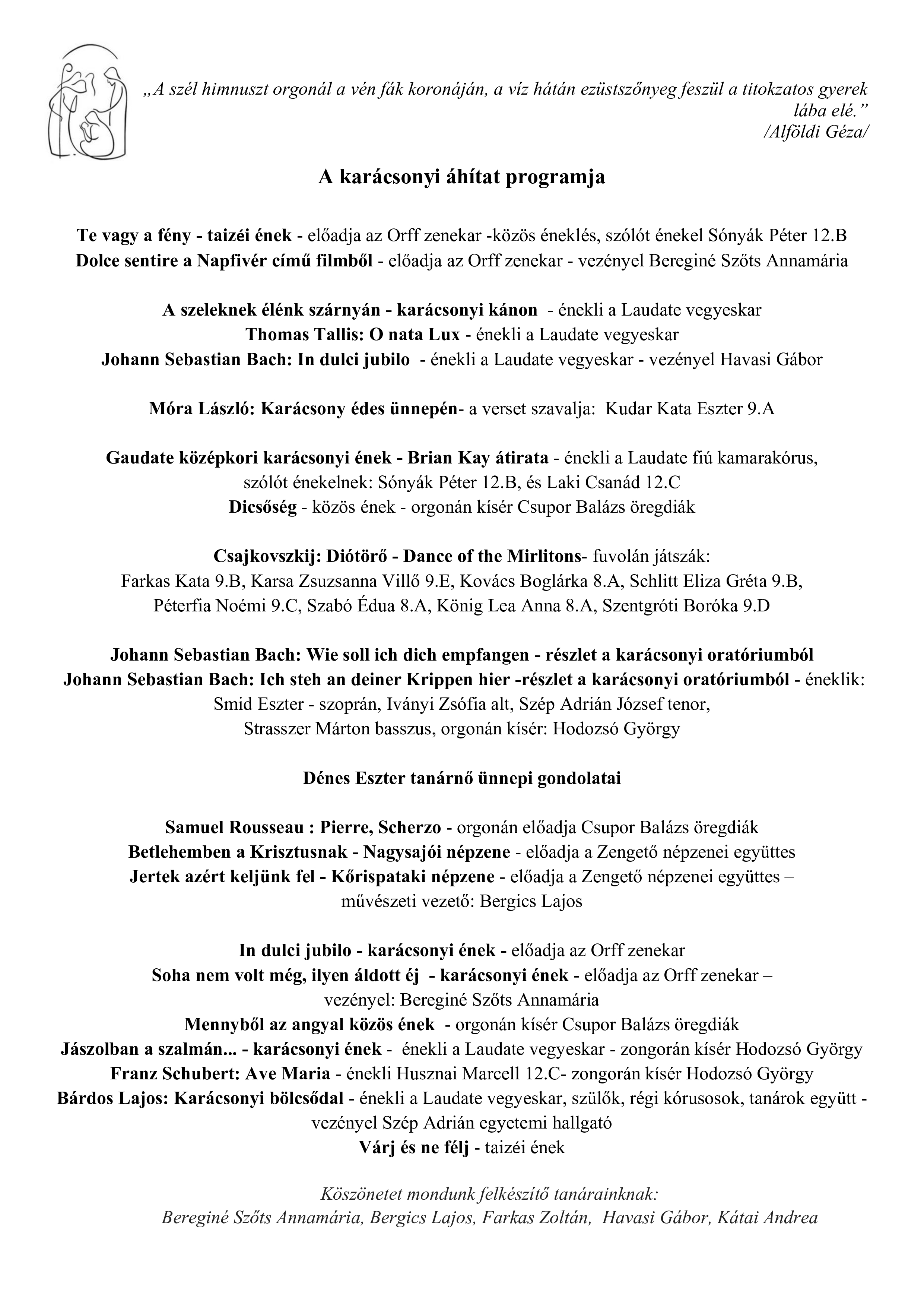 Dénes Eszter igazgatóhelyettes asszony osztotta meg velünk ünnepi gondolatait. Arról beszélt, hogy az igazi ajándék nem kézzelfogható, nem is a karácsonyfa alatt keresendő, hanem a közösségünkben. Annak ereje jelenti az igazi örömet: ilyenkor egymást ajándékozzuk meg a jelenlétünkkel, az időnkkel.